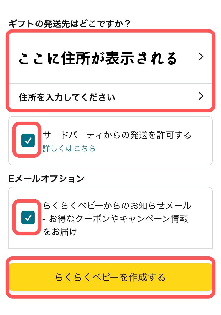 3. 住所を確認したら「らくらくベビーを作成する」を押す