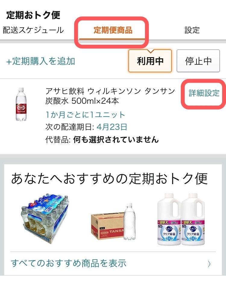 - 「定期便商品」を選び「詳細設定」をタップ